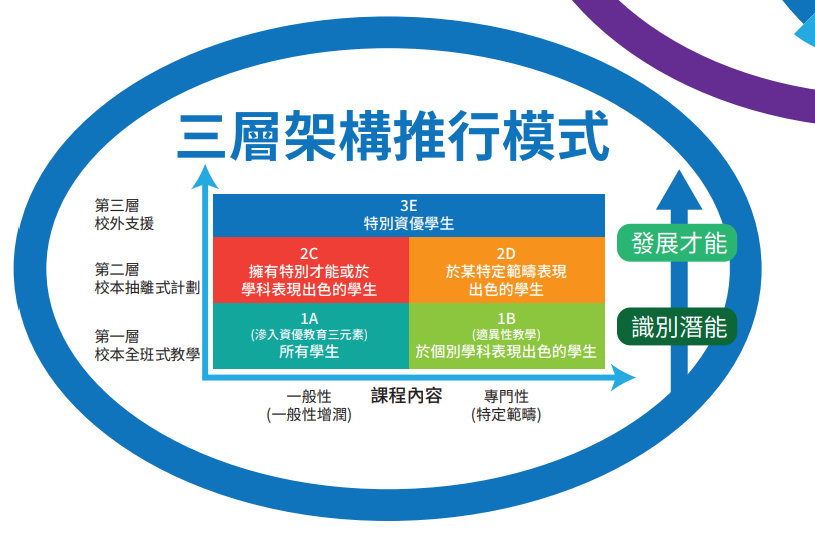 (c)第三層是指在校外為特別資優學生,提供特定的專門訓練學習機會。如參與資優教育學苑提供的課程,讓特別資優的學生能得到更適切的環境,學習更多元化的課題。